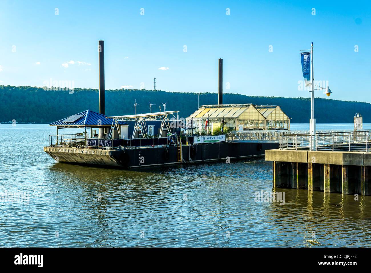 Yonkers, NY - Aug 13, 2022 Landscape view of the Science Barge, a self