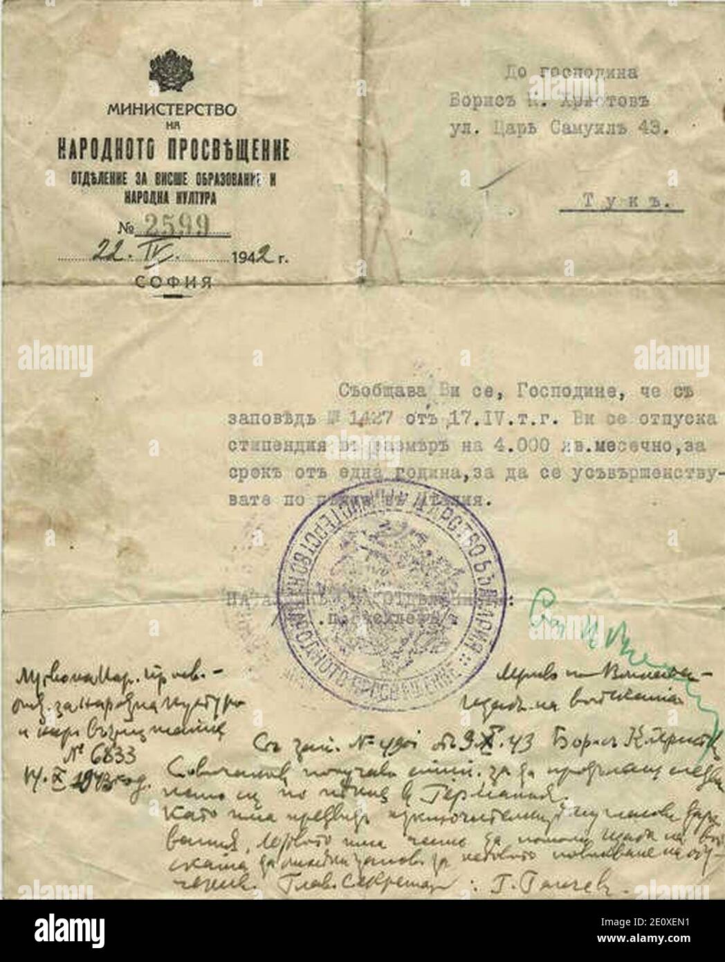 Letter from the Bulgarian Ministry of Education to Boris Hristov, 22