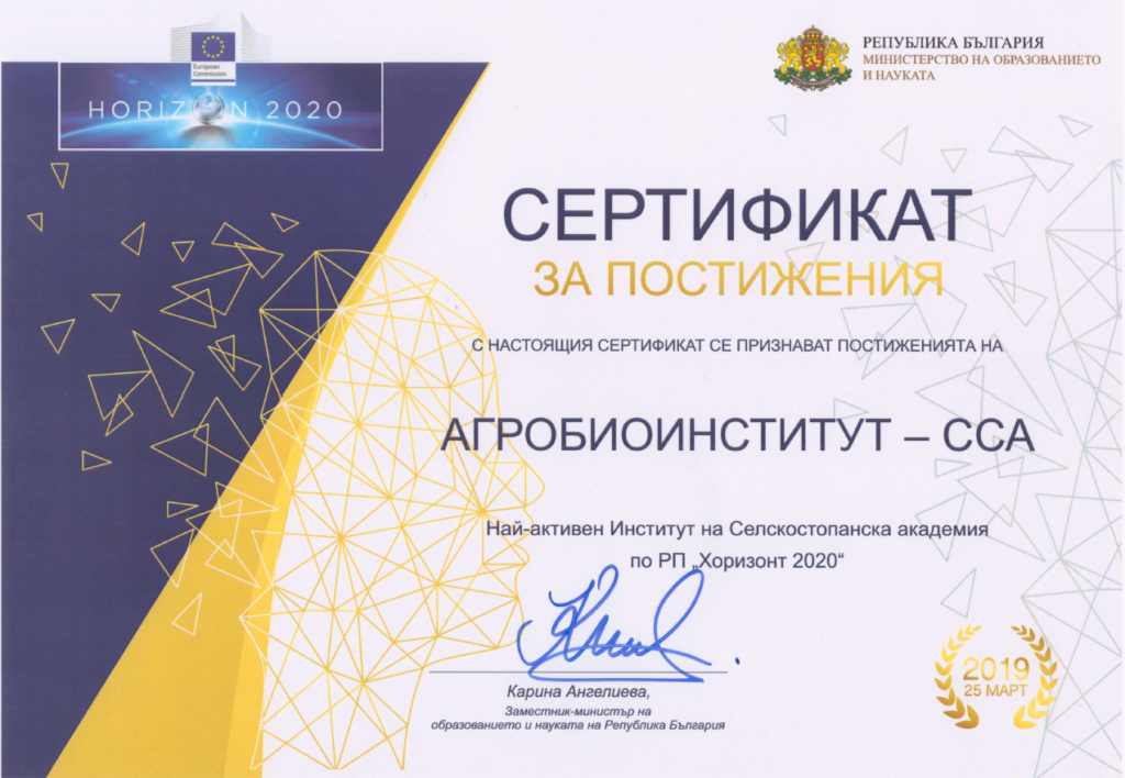 Agrobioinstitute awarded by Bulgarian Ministry of Education and