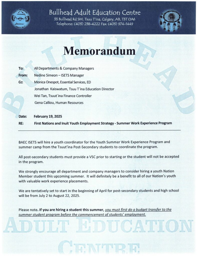 Memo - Bullhead Adult Education Centre | Tsuut'ina