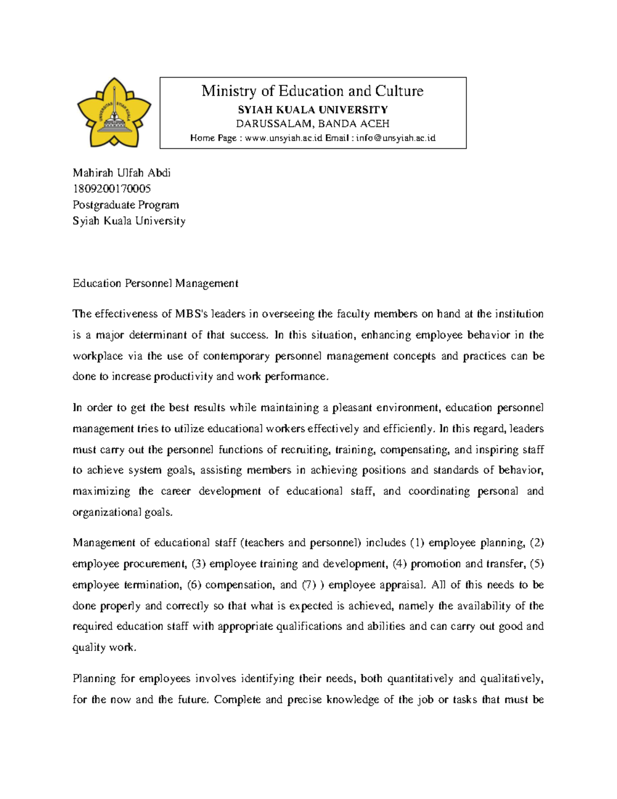Education Personnel Management - Mahirah Ulfah Abdi 1809200170005