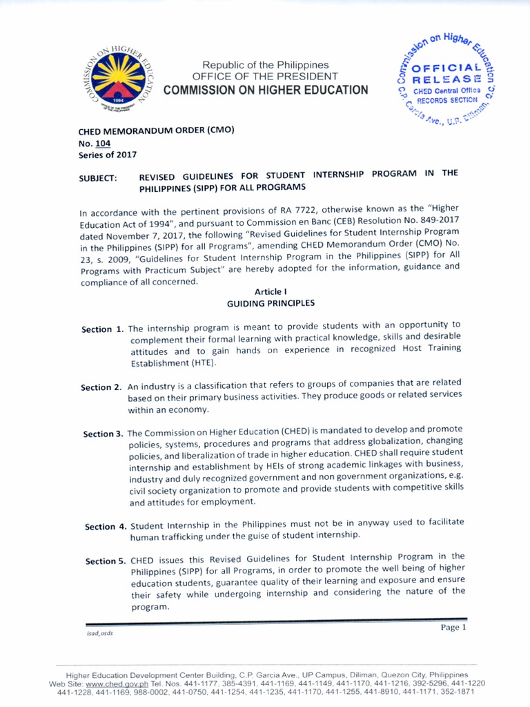 Ched Memo On Internship CMO-NO.-104-S.-2017 PDF | PDF