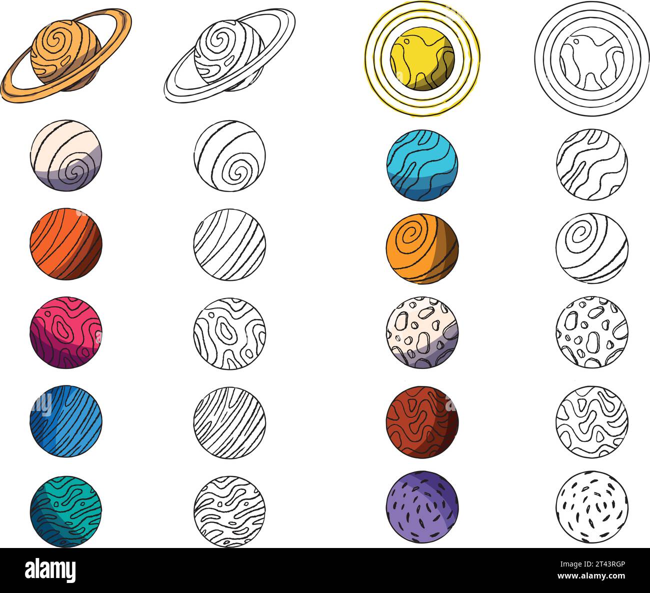Set of Vector Doodle Cartoon Icons Planets of Solar System. Comic