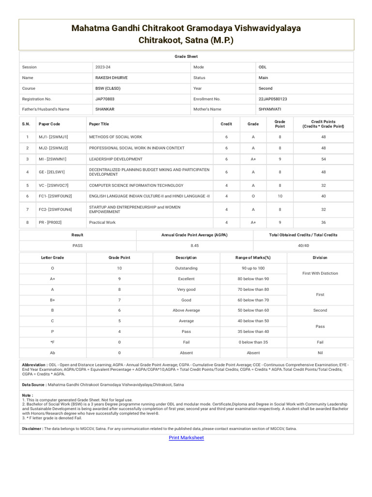 M G Chitrakoot Gramodaya Vishwavidyalaya Distance Learning, Indore