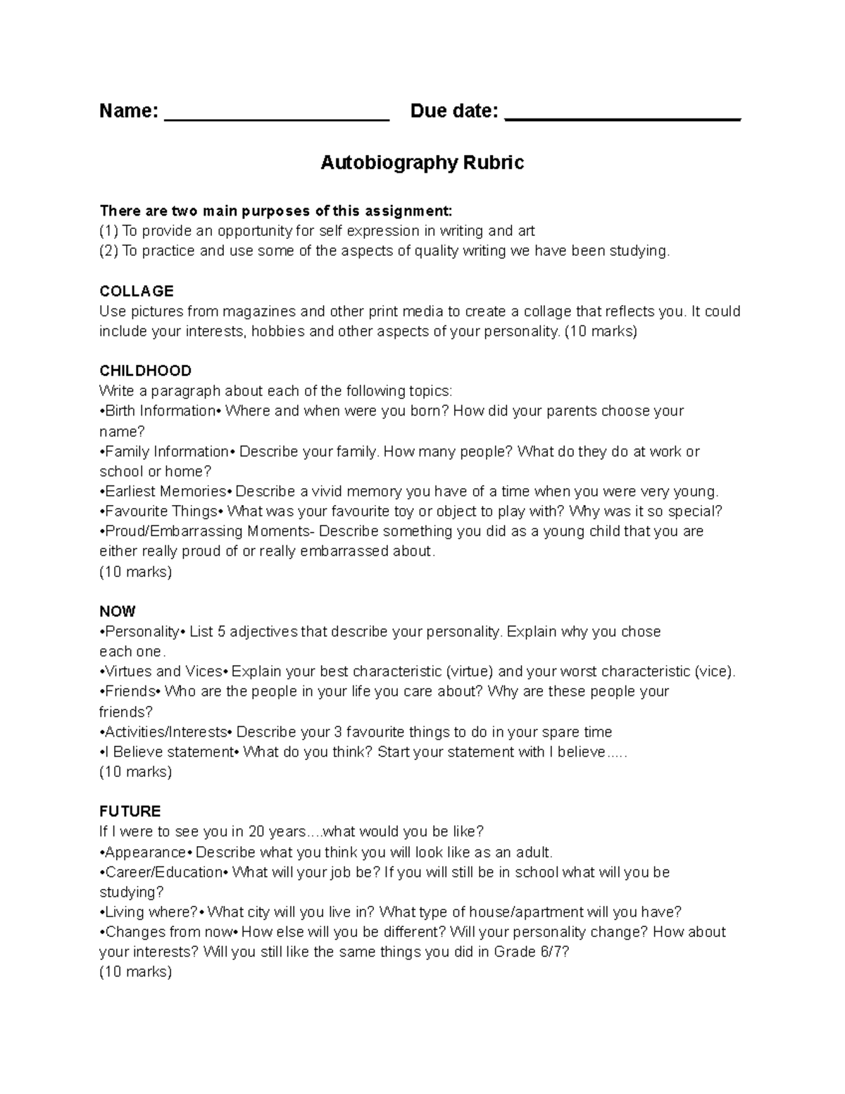 Autobiography Assignment Rubrics and Peer Assessment Form | PDF