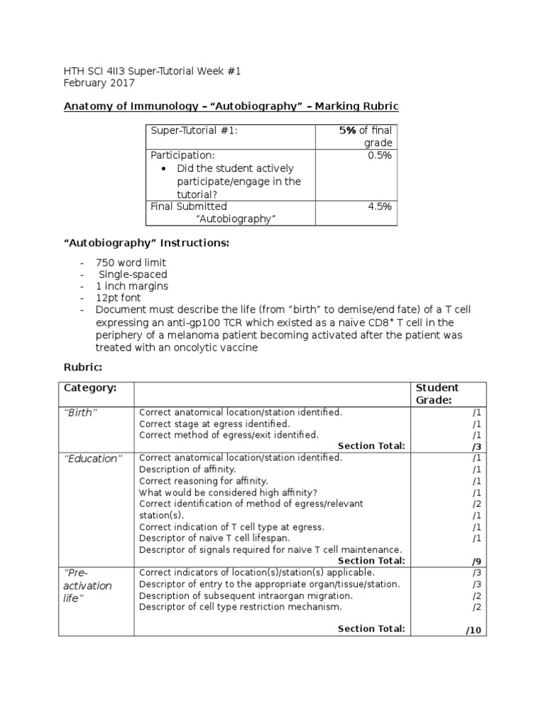 Anatomy Autobiography Rubric 2017 | PDF | T Cell | Lecture