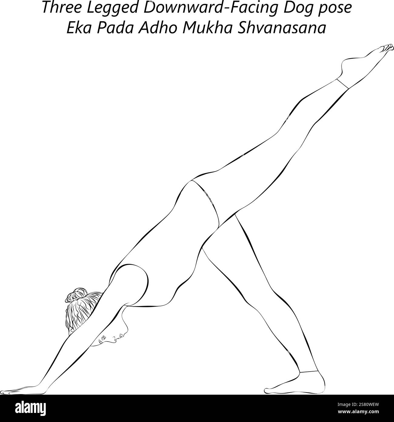 Sketch of young woman practicing Eka Pada Adho Mukha Shvanasana yoga