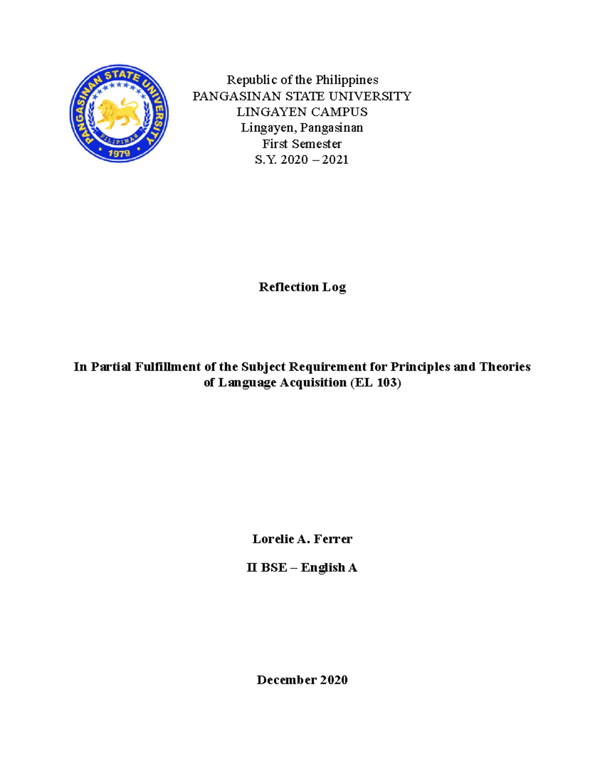 Ferrer-Lorelie-A - Reflection log - BS. education - PangSU - Studocu
