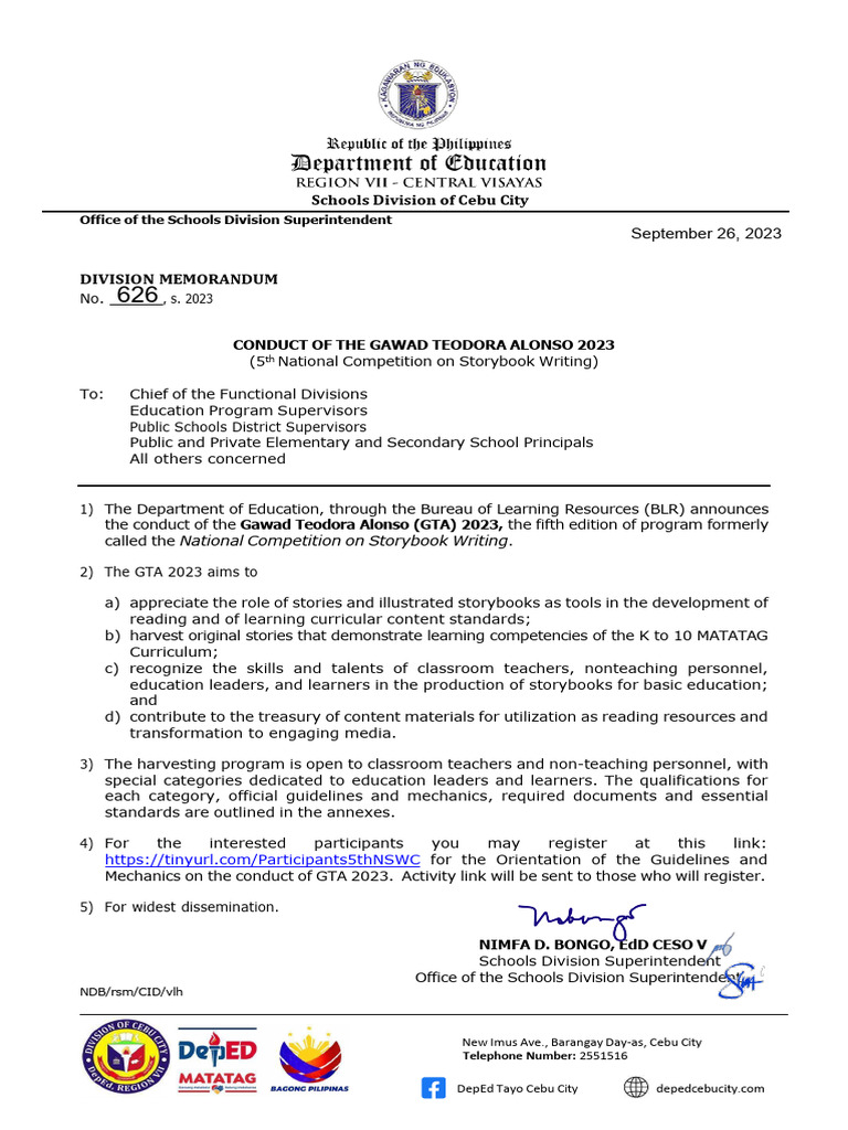 DM 2023 0626 Conduct of The Gawad Teodora Alonso 2023 | PDF | Pedagogy