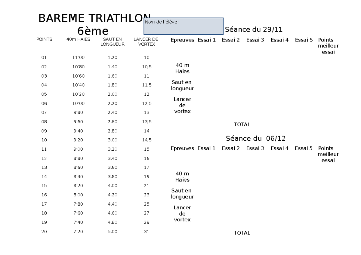 Copie de triathlon grille - BAREME TRIATHLON 6ème Epreuves Essai 1