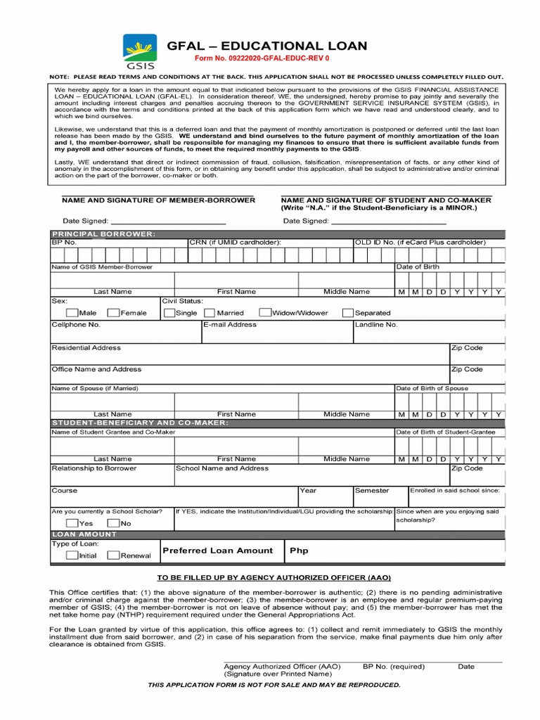 Are you or a family member in the pursuit of higher education, but grappling with the financial burden of tuition fees? The GSIS Education Loan could be the solution you need. This loan. What is the GSIS Financial Assistance Loan – Educational Loan (GFAL-EL)? GFAL-EL is an educational loan program offered by GSIS to its members to pay for the tuition fees and other. We hereby apply for a loan in the amount equal to that indicated below pursuant to the provisions of the GSIS FINANCIAL ASSISTANCE LOAN — EDUCATIONAL LOAN (GFAL-EL).