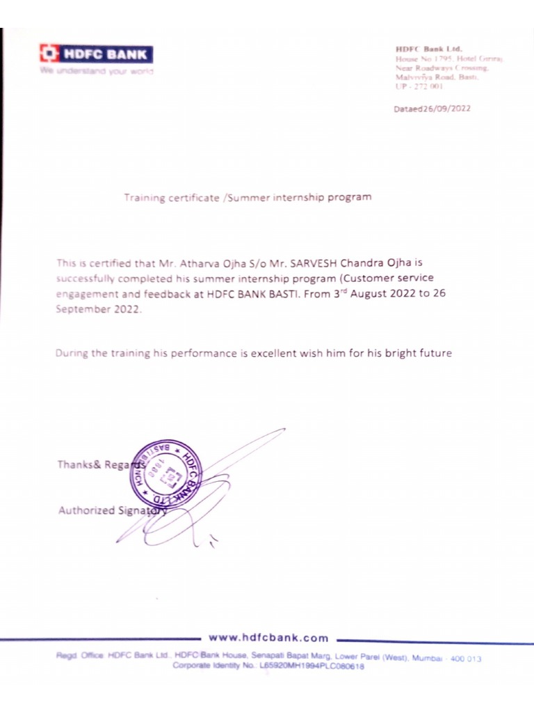 Atharv Ojha HDFC Bank Internship Certificate | PDF