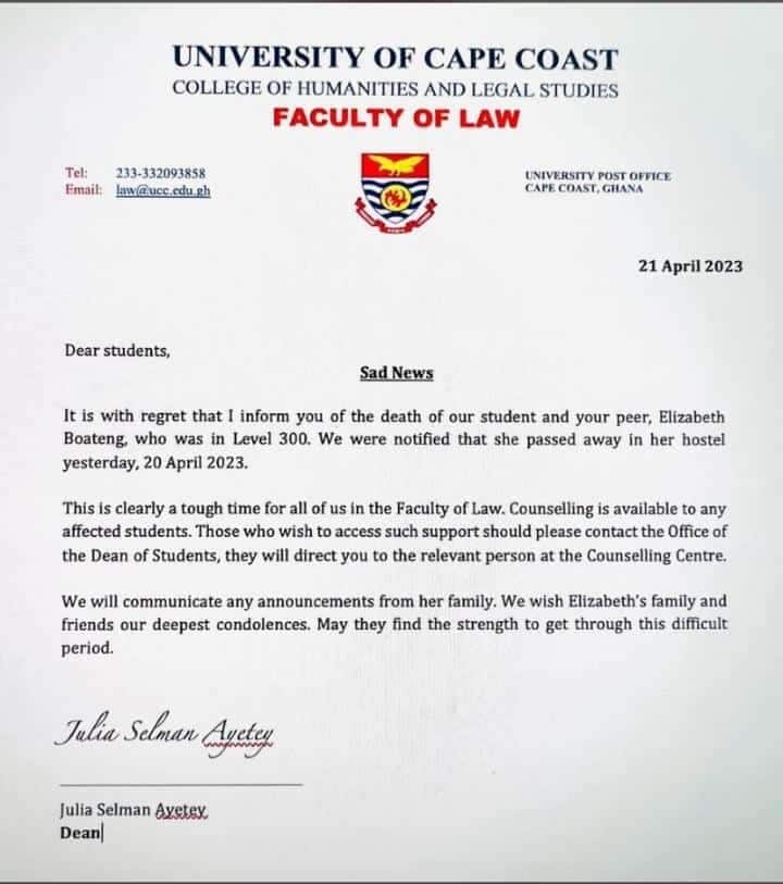 Level 300 UCC law student found dead in her hostel