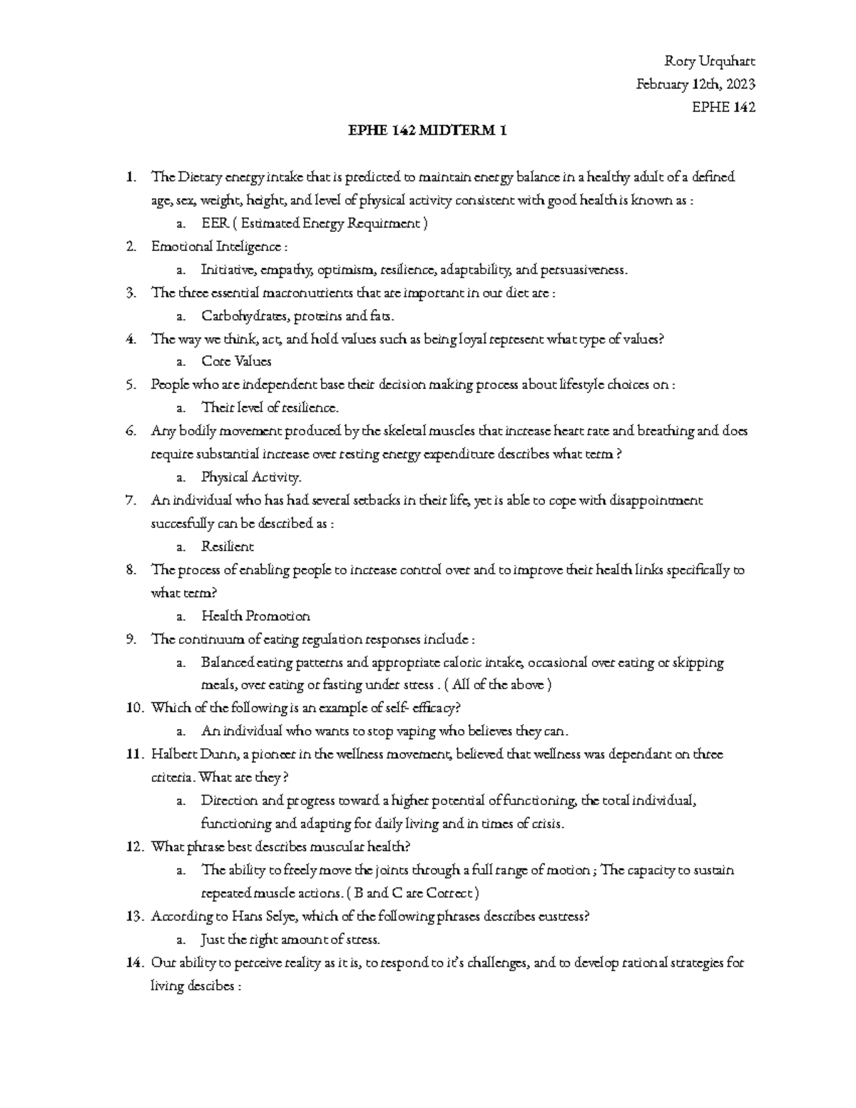 EPHE 142 Midterm 1 - Notes - February 12th, 2023 EPHE 142 EPHE 142
