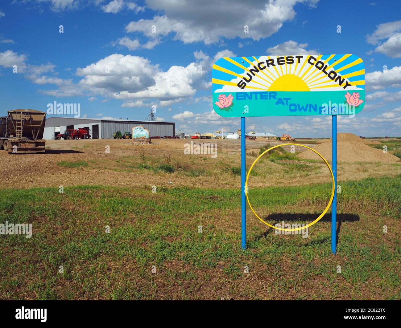 Suncrest Colony sign, Hutterite colony community, near Coronation