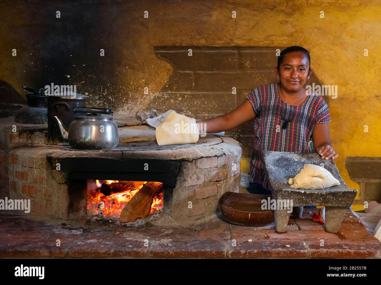 Smiling indigenous mexican woman with corn tortilla pancake making the
