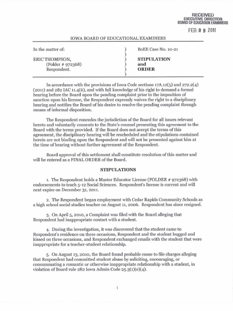 Iowa Board of Educational Examiners Final Order Re Eric Thompson | PDF