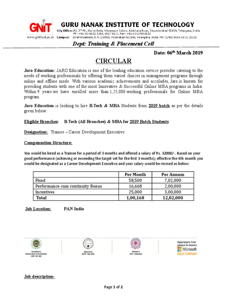 Jaro Education Drive On 07.03.19 For B.tech & MBA 2019 Batch GNIT | PDF