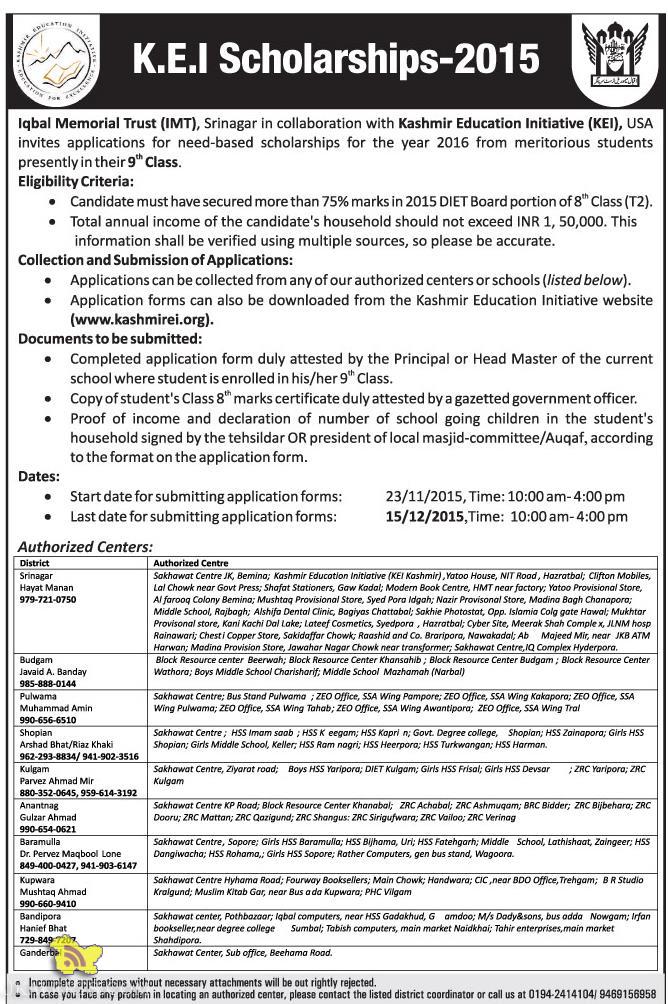 Kashmir Education Initiative (KEI) Scholarship 2015 | JKAlerts JK Updates.