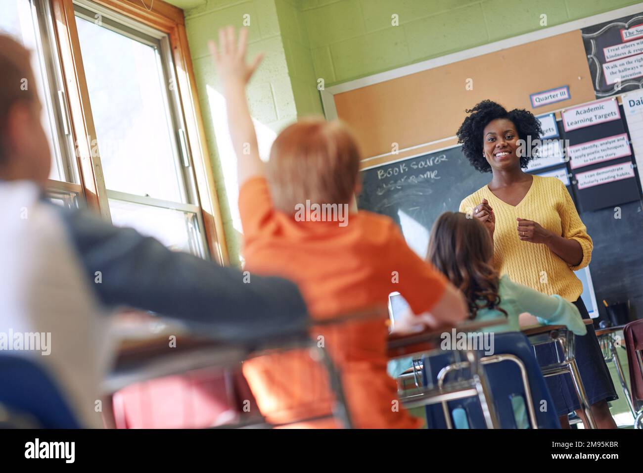 Education, teacher and children in classroom with question in academy