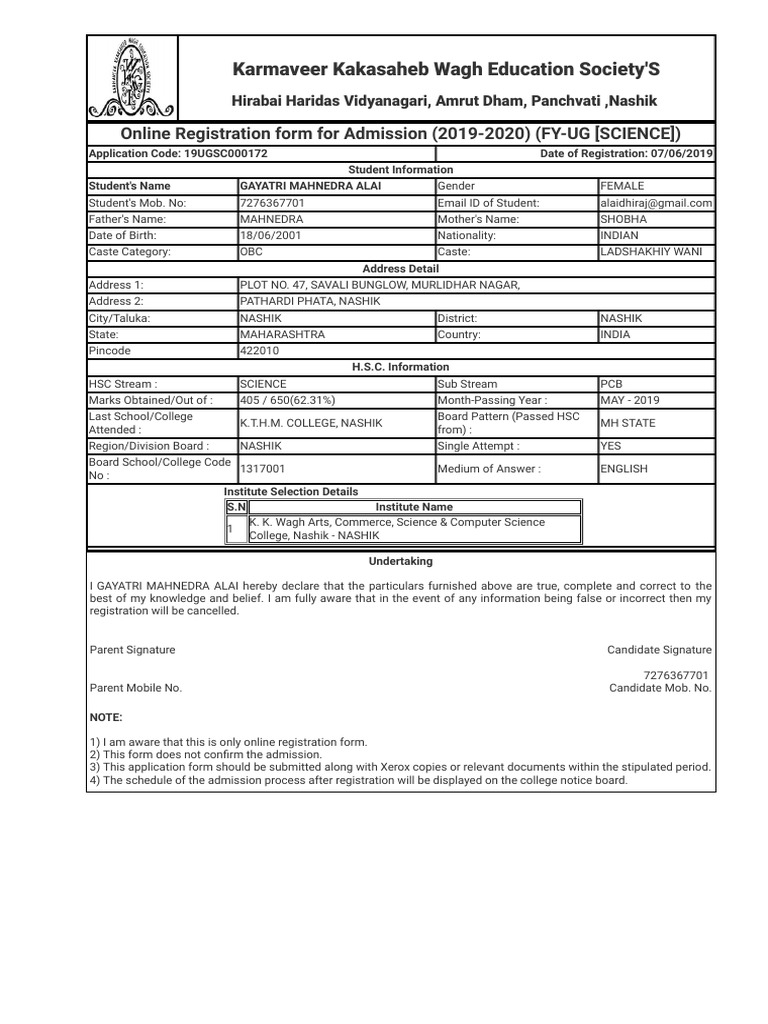 Karmaveer Kakasaheb Wagh Education Society'S: Online Registration Form