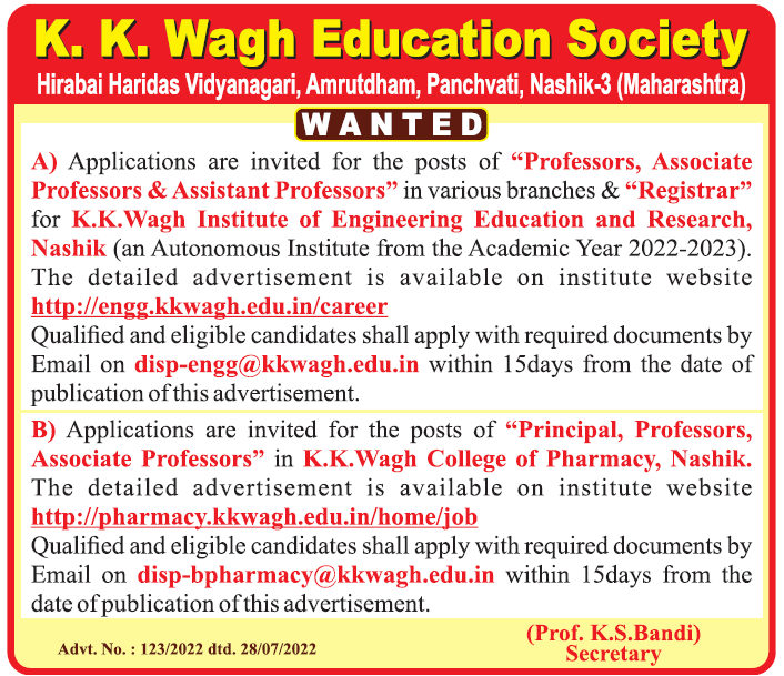 K.K.Wagh Education Society, Nashik Wanted Professor/Associate Professor