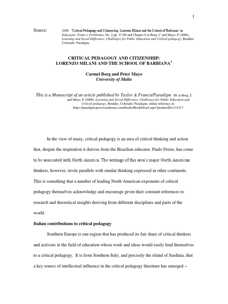 10 Critical Pedagogy and Citizenship Lorenzo Milani and The School of