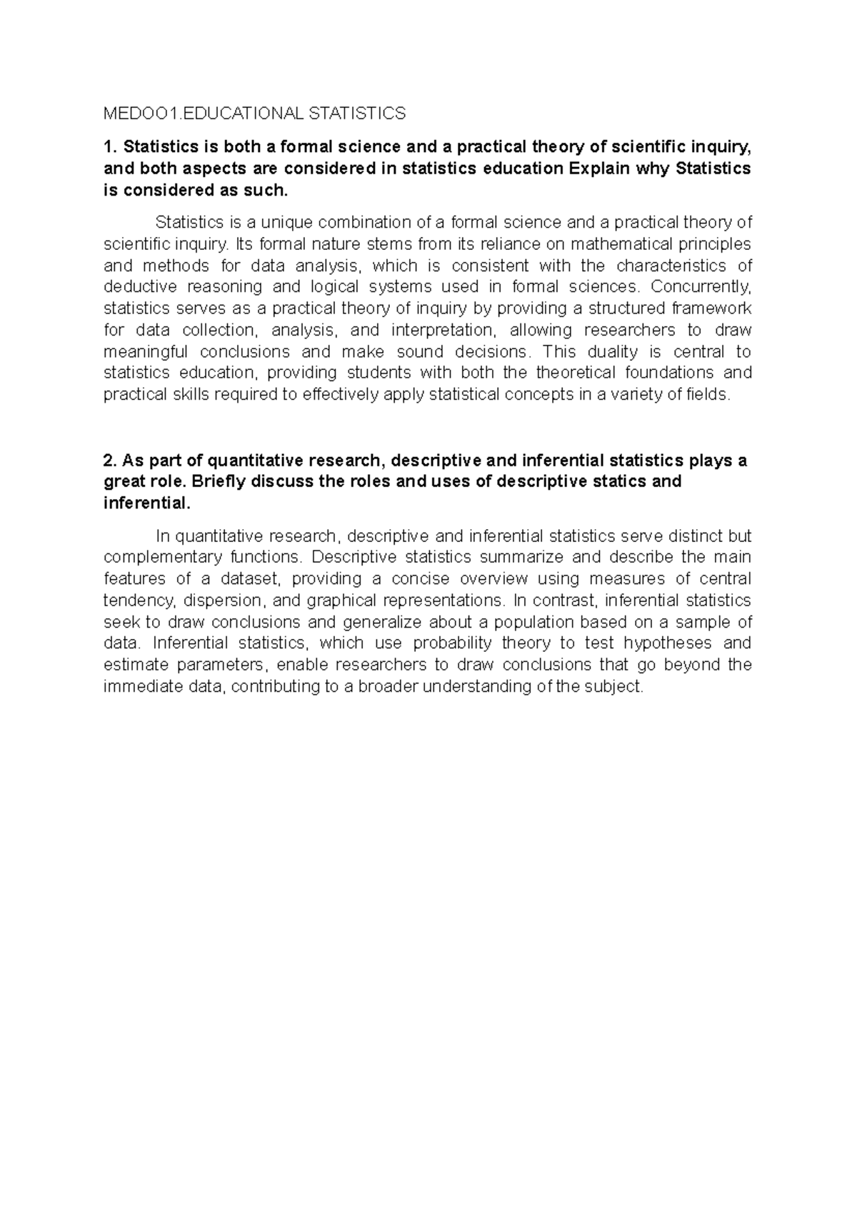 Final exam 1 - research - MEDOO1 STATISTICS Statistics is both a formal