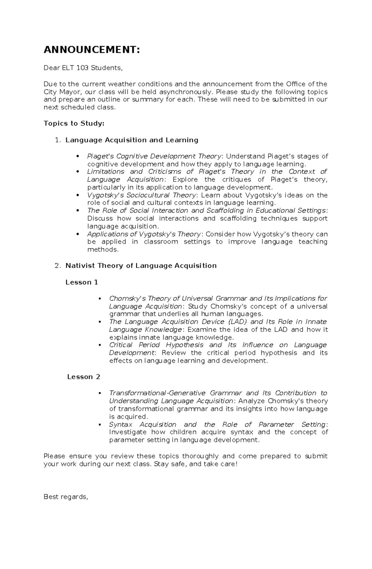 ELT 103 Activity ( Chapter 2) - ANNOUNCEMENT: Dear ELT 103 Students