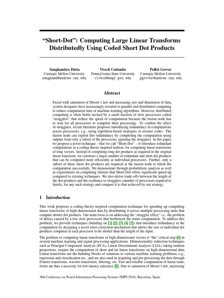 NIPS 2016 Short Dot Computing Large Linear Transforms Distributedly