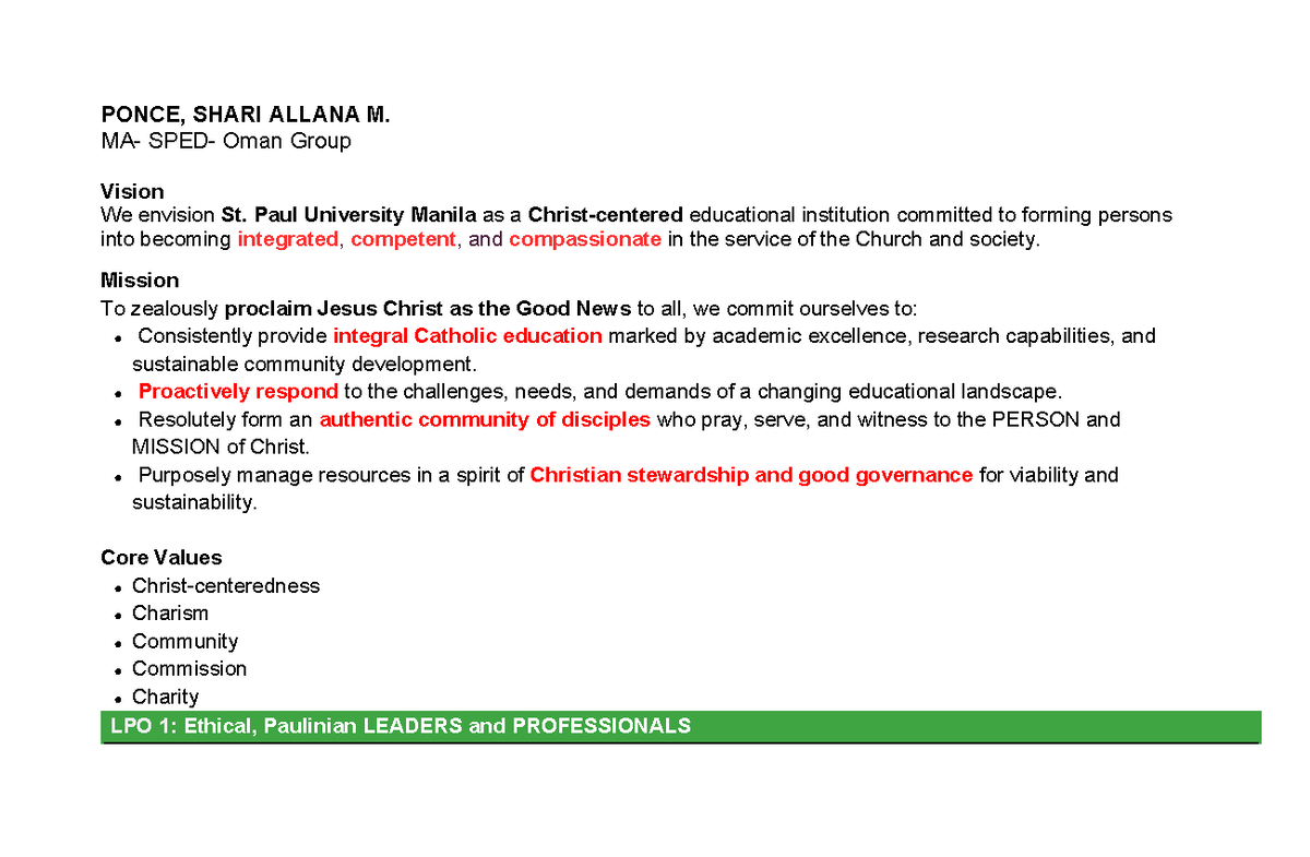 PAULINIAN CORE VALUES - St. Paul University Philippines
