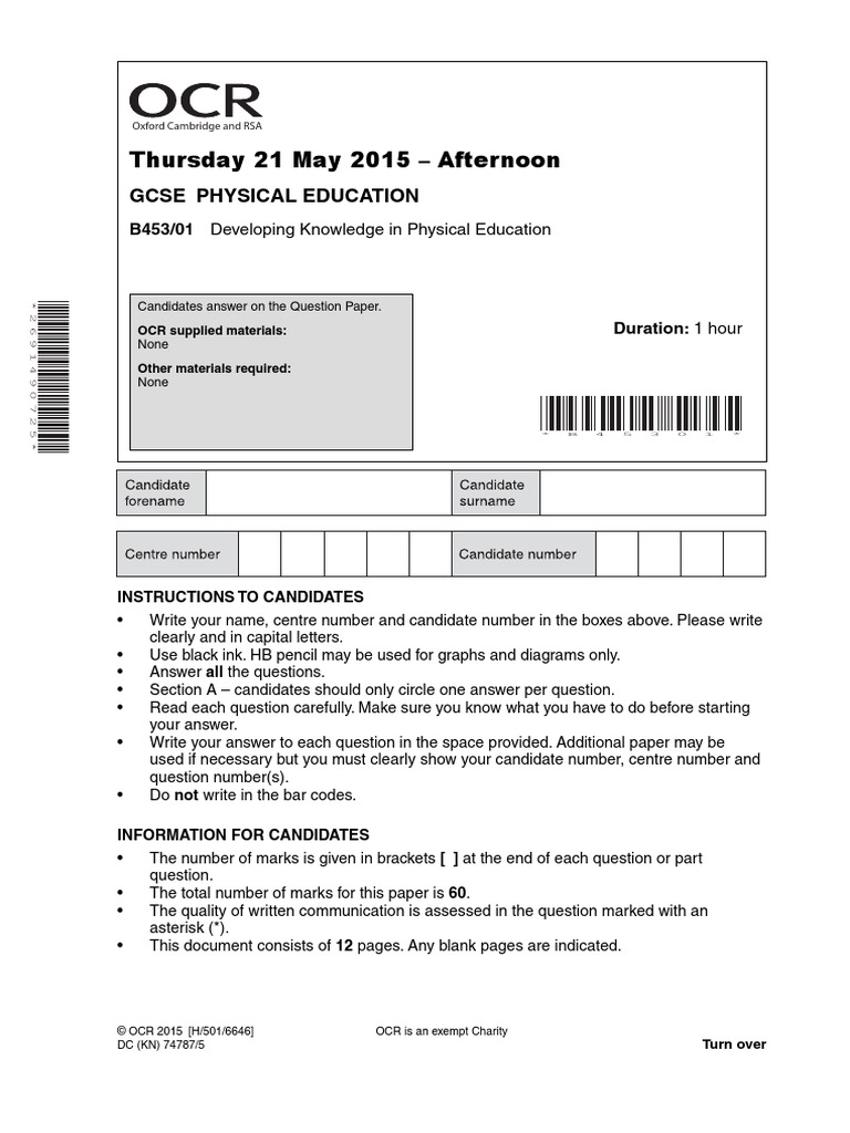 Question Paper Unit b453 Developing Knowledge in Physical Education