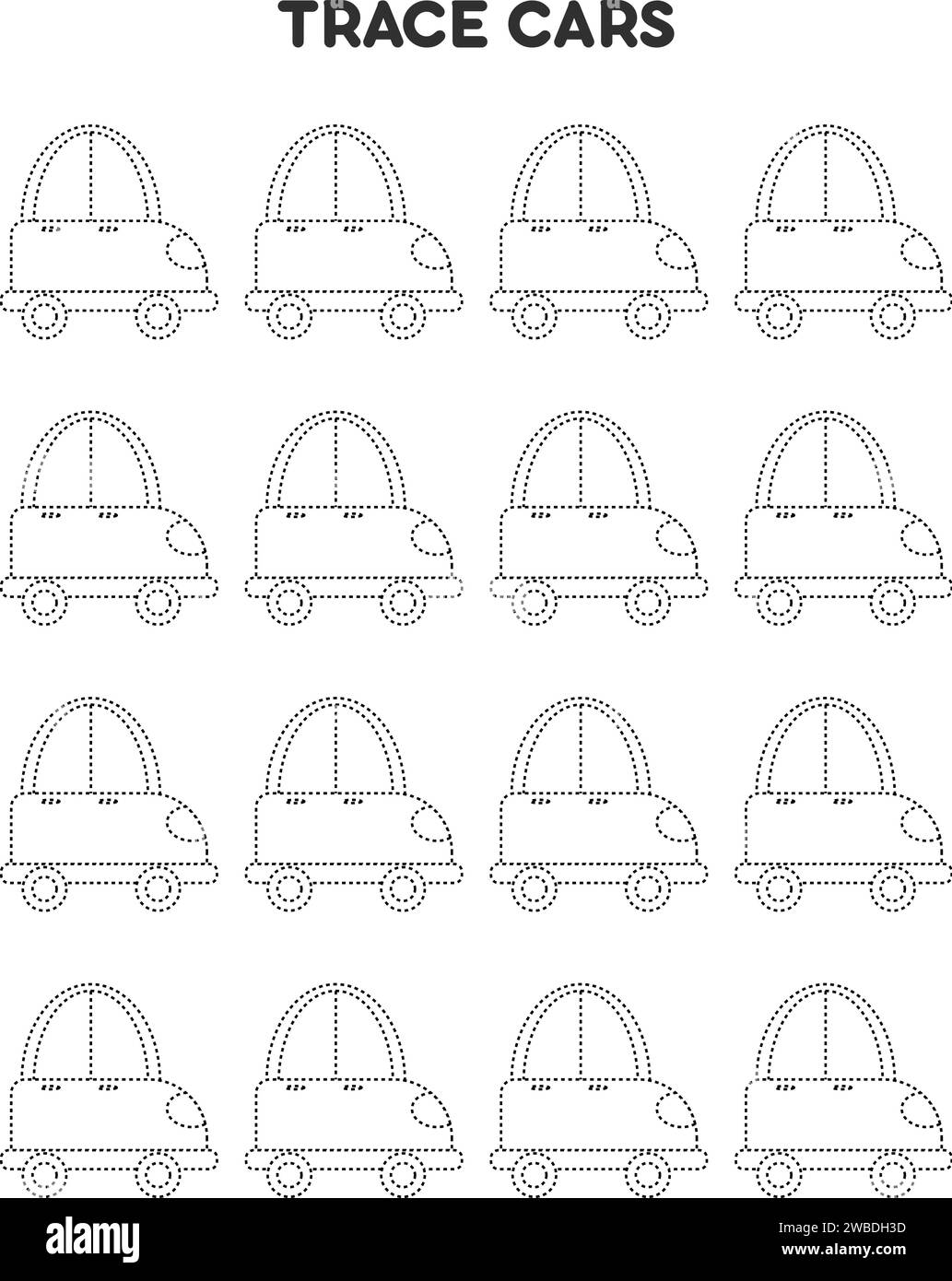 Trace cars. Worksheets for kids. Preschool education Stock Vector Image