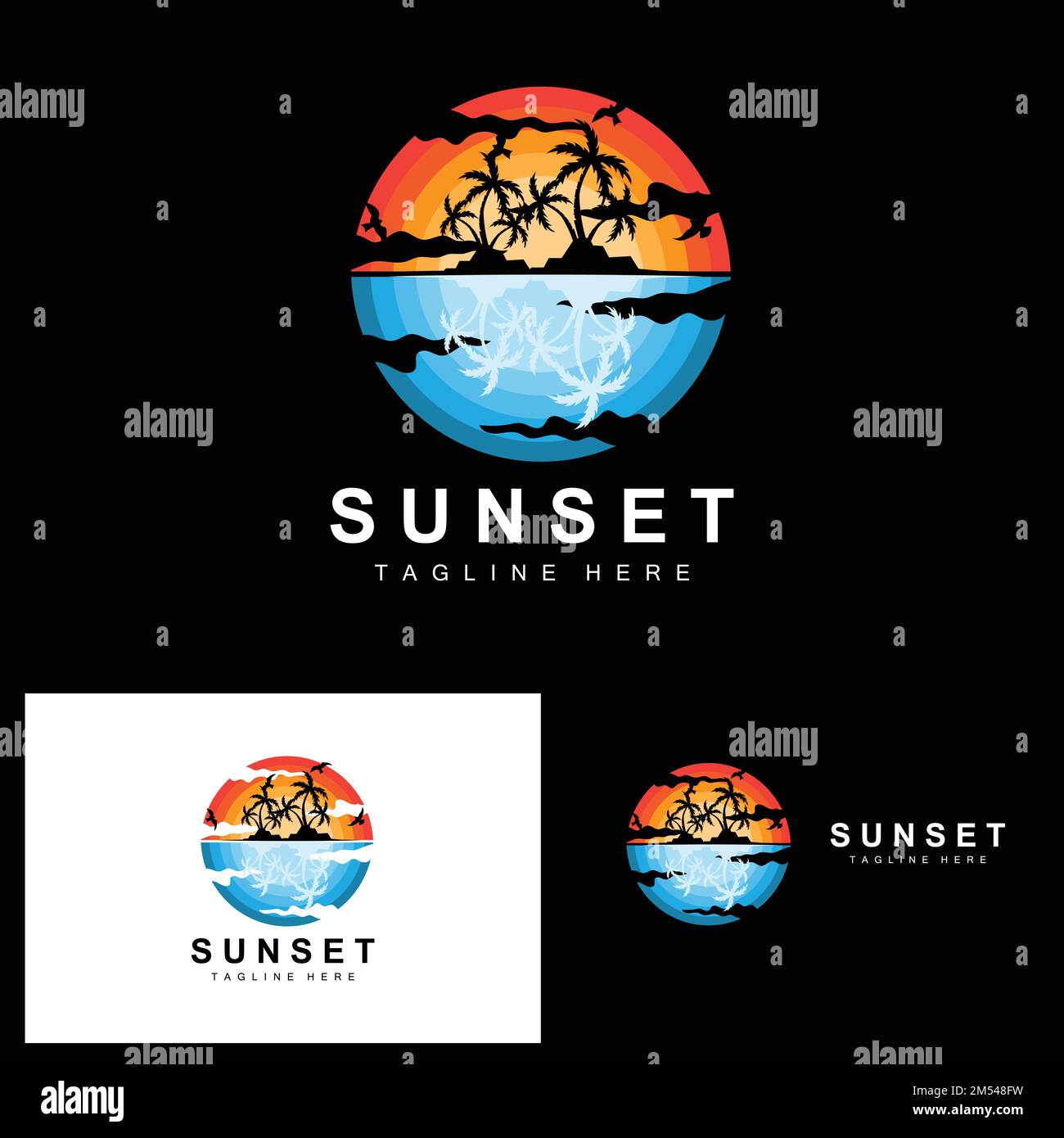 Sunset Beach Logo Design, Seascape Illustration, Red Day Vacation Spot