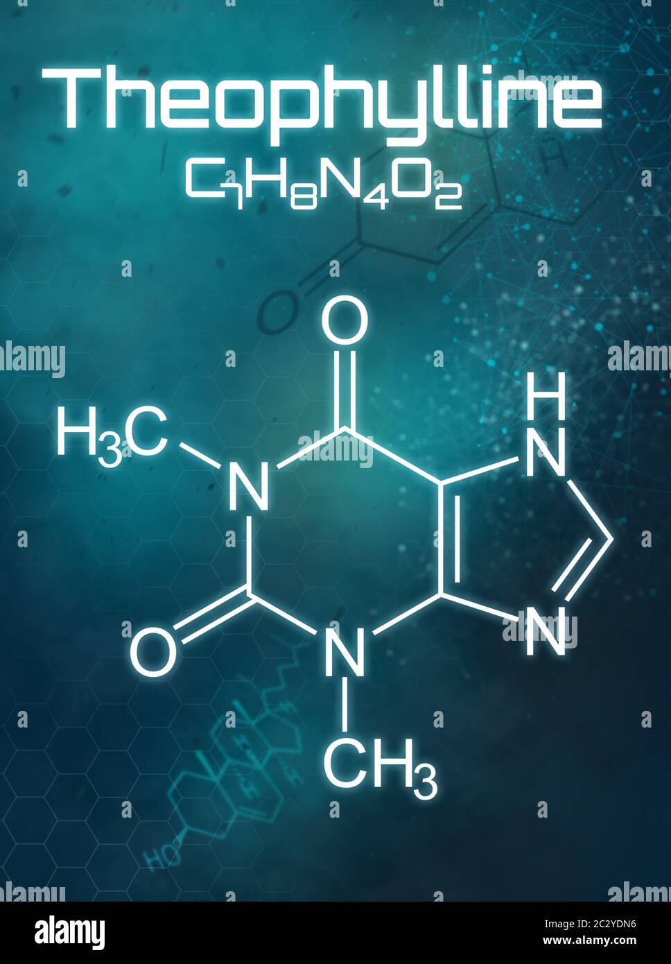Chemical formula of Theophylline on a futuristic background Stock Photo