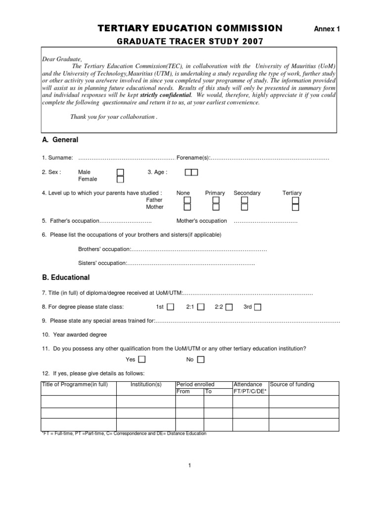 Tracer Study Questionnaire | Employment | Vocational Education